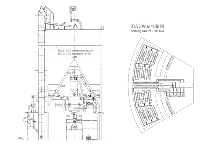 IBAU均化庫是我們南通江森機械制造有限公司采用德國尹堡公司的連續(xù)均化技術,經(jīng)國產(chǎn)化設計在水泥行業(yè)得到廣泛應用的一款均化設備。均化庫的庫底中心設一大圓錐,庫內(nèi)生料的重量通過該錐體傳遞給庫壁,庫底環(huán)形空間分成向中心傾斜10°的6個(或多個)充氣區(qū),每個充氣區(qū)設一個卸料口,卸料口的上方用一個徑向放置的減壓錐將料層隔開,不讓卸料口上方的料流直接進入卸料口,整個環(huán)形區(qū)生料在各區(qū)中有兩個以自上而下切割水平料層的流動而產(chǎn)生重力混合均化的料柱,再經(jīng)卸料口兩側形成料流的對流混合流向卸料口,圓錐下設外攪拌倉,各區(qū)的生料循環(huán)進入攪拌倉后,經(jīng)連續(xù)強烈的充氣攪拌得到進一步均化。均化比為6-8,耗電為0.1-0.2kW/t。