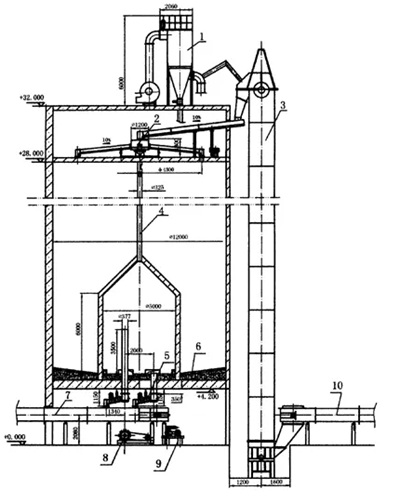 連續(xù)式均化庫是生料從庫頂連續(xù)進料,經(jīng)過充氣攪拌的同時連續(xù)出料,庫在中心位置設(shè)一個圓柱形混合室,以降低庫內(nèi)卸料壓力,消除漏斗流。在混合室周圍6-12卸料孔,在混合室與庫壁之間有6-12個充氣區(qū),卸料時輪流向中心室進料,進入混合室的物料因混合室連續(xù)充氣而進一步混合,使合格的生料從高位溢流管卸出,多余氣體則由排氣管排至外環(huán)區(qū),并抽至收塵器凈化,但要求生料制備系統(tǒng)連續(xù)穩(wěn)定可靠,具有投資省,電耗低,工藝布置靈活,結(jié)構(gòu)緊湊,操作簡單等特點。